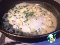 Влить молоко, довести до кипения, ввести сыр маленькими кусочками. Готовить, помешивая, пока сыр не разойдётся и не соединится с молоком и луком. |