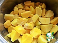 Картофель делим на более мелкие кусочки, чтобы быстрее сварился. |