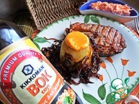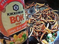 Когда сильно зарумянится, влить в горячую сковороду соевый соус Киккоман ВОК. |