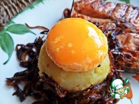 Отделить желток от белка и осторожно перелить его в сковороду (можно после лука). Быстро обжарить, но чтобы верх остался жидким. Перенести на картофельную башенку. |