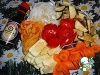 Готовить можно в любой глубокой посуде, всё укладывается слоями. Вначале мясо переложить в жаровню-казанок, мясо должно закрыть полностью дно, добавить немного растительного масла и выкладывать слоями на мясо: слой лука полукольцами,