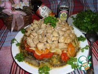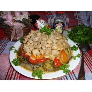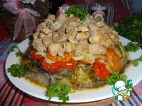 слой баклажанов кусочками, подсолить и поперчить,