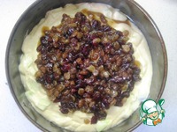 Форму для выпечки (диаметр 20 см) чуть смазать растительным маслом, выложить половину теста, разровнять. Выложить сверху изюмную начинку, оставляя по краям 1.5-2 см теста. |