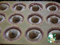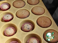 Духовку разогреть до 180 градусов. Формы для кексов заполнить бумажными капсулами и наливать тесто для кексов на 1/2 объема. Выложить шарик печенья. |