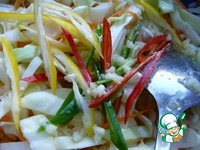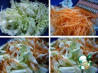 Капусту нашинковать не очень тонко. Морковь натереть на китайской терке. Слегка перемешать без усилий, присолить. |