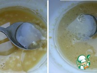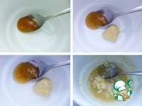 Приготовим заправку. В мисочке смешать мед, горчицу, винный уксус, выдавить чеснок через пресс, перемешать. |