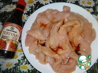 Куриное филе порезать длинными тонкими полоскоами. Полить соевым соусом-маринадом и оставить на 20 мин. |