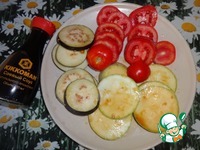 Кабачок, баклажан и помидор порезать кольцами. Полить соевым соусом. |