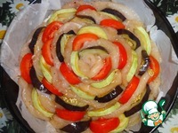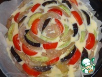 Филе перекладывать овощами - кабачок, баклажан и помидор порезанные полукольцами. |