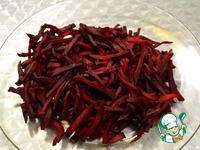 Свёклу нарезаем тонкой соломкой. Можно натереть на крупной тёрке длинными полосками. |