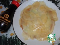 «Лепестки» будущей «розы» толщиной 1-1,5 мм нарезать из сырого картофеля на специальной терке для овощей. "Лепестки" должны получиться тонкие и полупрозрачные. Поливаем соевым соусом. |