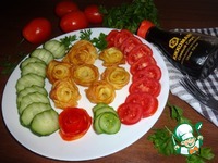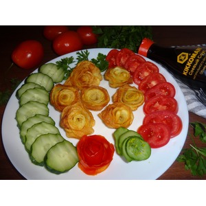 Описание: Такие оригинальные розочки приготовленные из картофеля и украшенные овощами, можно подавать как гарнир к любому мясу, а можно и как самостоятельное блюдо.