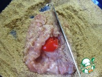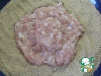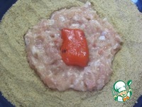 В плоскую тарелку насыпать сухари для панировки. Из фарша сделать небольшую лепешку, положить в сухари. В центр положить кусочек уже остывшего болгарского перца. |