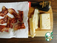 Пока картофель варится, обжарим бекон до хрустящего состояния, нарежем сыр тонкими ломтиками. Сыр может быть любой, я взяла моцареллу для запекания. |