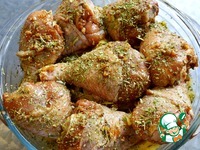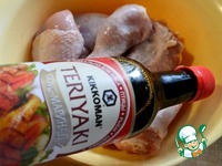 Куриные голени маринуем в соевом соусе Kikkoman Teriyaki с сушёным зелёным базиликом. |