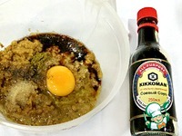 Добавить яйцо специи по вкусу, хмели-сунели и соевый соус от ТМ Kikkoman. Перемешать. |
