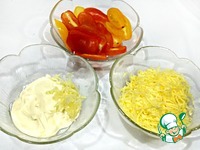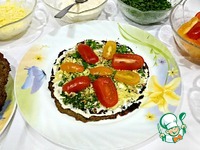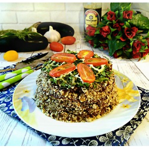 Затем присыпать сыром, орехами, зеленью и сверху распределить кружочки помидоров. Сверху кладем следующий корж и проделываем все то же самое. |