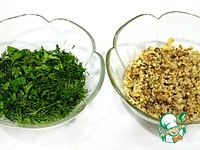 Зелень порезать мелко, орехи измельчить как можно мельче, чтобы не раздражали куски при употреблении. Я орехи тщательно измельчила с помощью скалки. |