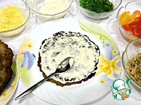 Теперь можно собрать торт. Корж обмазать чесночным майонезом (~ по 2 ч. л. на корж). |