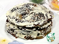 Уложив последний корж, обмазать сверху и бока оставшимся чесночным майонезом. |