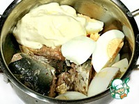 В емкость сложить рыбные консервы, отваренные яйца и плавленный сыр. Добавить 1 ст. л. жидкости от рыбных консервов. |