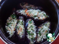Выкладываем все в кастрюлю. В идеале каждый баклажан нужно обмотать веточками сельдерея, но у меня его не было. Это не катастрофично, но запах был бы намного ароматней в конце! |