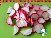 Редис нарезаем тонкими кольцами или полукольцами в зависимости от размера. |