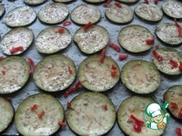 Выступившую жидкость промокнуть салфеткой. Поверхность баклажанов слегка смазать маслом. Перец мелко порезать. Посыпать баклажаны сухим или свежим розмарином и кусочками чили. |