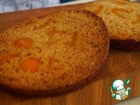 1. Приготовим бисквит: яйца смешать с сахаром, добавить молоко, варенье, просеянную муку и гашеную соду, хорошо перемешиваем. Тесто перелить в форму (у меня 22 см), застеленную пергаментом и смазанную маслом. Выпекать в разогретой до 180* духовке 30 - 35 мин. Готовый бисквит слегка остудить, разрезать на два коржа.