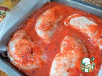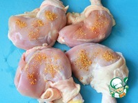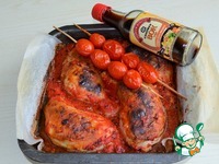 Залить окорочка соусом и отправить в духовку. Запекать 40 минут при 190 - 200 градусах, несколько раз поливая соусом, за 10 минут до окончания выложить к окорочкам шпажки с черри. |