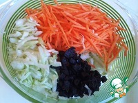 Перемешать в салатнике капусту, морковь и чернослив. |
