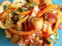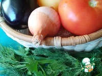Выложить в салатник кубики картофеля, кусочки помидоров, кружочки баклажанов, полоски сладкого перца и измельченный репчатый лук. Перемешать. |