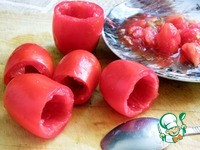 Помидоры вымыть, обсушить и отрезать крышечки. Чайной ложкой вынуть мякоть, посолить внутри и поперчить. |
