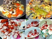 Нарезала лук, морковь и высыпала в разогретую сковороду с маслом. Нарезала грибы, добавила заправку и всё обжарила до лёгкой румяности. Сосиски нарезала кольцами. |