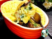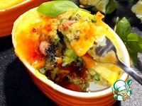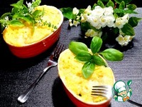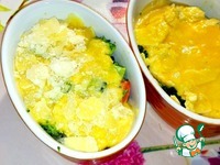 Сверху насыпала пармезан и залила яичной смесью. В середину положила по кусочку масла и посыпала пармезаном сверху. |