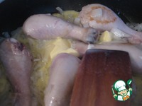 Берем большую глубокую сковороду, разогреваем масло, выкладываем лук и голени (можете брать любые части курицы) |