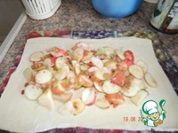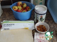 Взяла половину из упаковки слоеного дрожжевого теста. Оно давно уже ждало своего часа в морозилке. Помыла яблоки, изюм. |