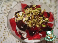 Сочетание мороженого и желе очень оригинально. Растопленный шоколад на мороженом слегка застывает и получается нежный вкус мягкого ириса. Фисташки дополняют десерт ореховым вкусом.