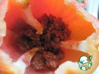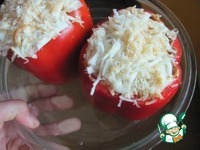 Слои повторить. На последний слой из теста выложить соус, мясо, опять соус и посыпать сыром. Поставить перцы в смазанную форму. Если перцы неустойчивы, то слегка срезать донышко. |