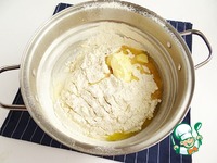 Затем добавляю просеянную муку, смешанную с дрожжами, сливочное масло комнатной температуры или растопленное. |