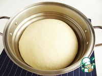 Тщательно замешиваю тесто, которое должно получится мягким, не липнуть к рукам. Накрываю тесто пленкой и даю ему увеличиться в размере. |