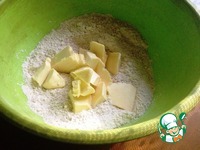 Смешать пшеничную и цельнозерновую муку с сахаром и солью. В мучную смесь добавить охлаждённое сливочное масло кусочками и перетереть в крошку. |