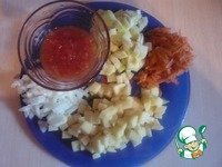 В это время чистим овощи. Картофель нарезаем кубиком, кабачок кубиком, лук мелким кубиком, морковь и помидор трем на терке |