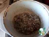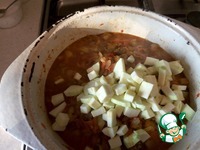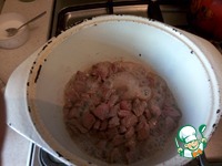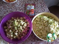 Режем мясо на кубики не очень крупные. Режем лук. Морковь трем на терке. Нарезаем остальное. Помидору, перец. |