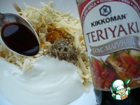 Добавить к сыру сметану, 1 ст. ложку соевого соуса - маринада Teriyaki "Kikkoman" и 0,5 ч. ложки куркумы, перец черный молотый по вкусу. Все хорошо перемешать. |