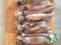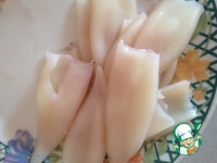 Подготовить свежие кальмары: отделить головку от туловища извлечь все внутренности очистить от кожицы под струей холодной воды |