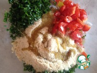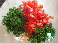 Затем мелко нарезать чеснок, помидоры черри и петрушку |