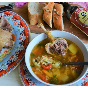 Описание: Вкусный суп с домашней уткой, диким рисом и овощами. Ароматный от приправ, и совсем не жирный, именно для этого и добавляется соевый соус. Угощайтесь.