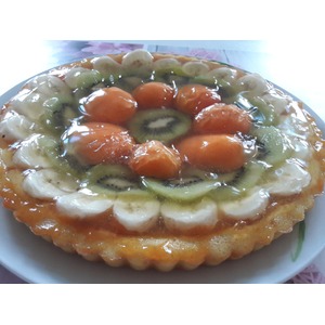 4. Остывший бисквит смазать вареньем, выложить красиво фрукты.