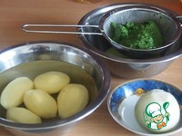 Шпинат разморозить, слегка отжать излишнюю влагу. Можно на ночь положить его сито, вода стечет. Шпинат лучше брать не в виде пюре, а в виде порезанных листьев. Почистить картофель и лук. |